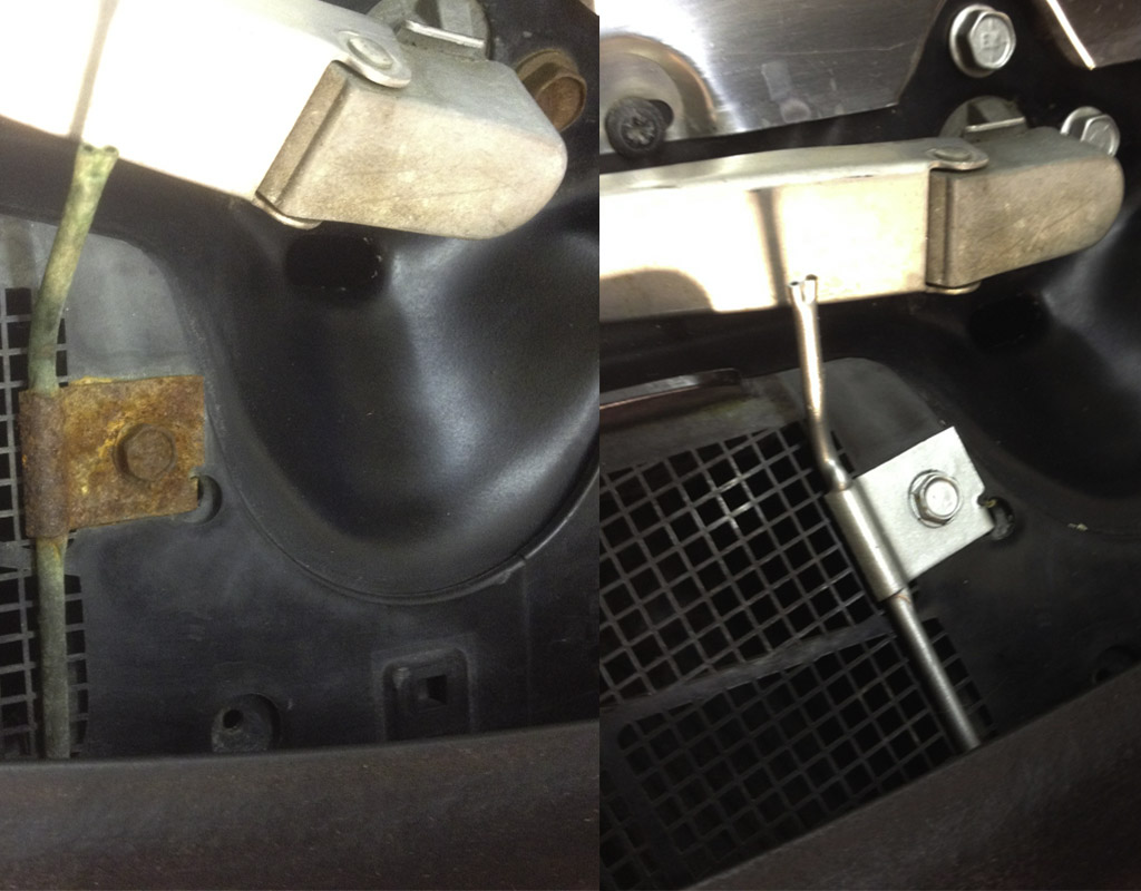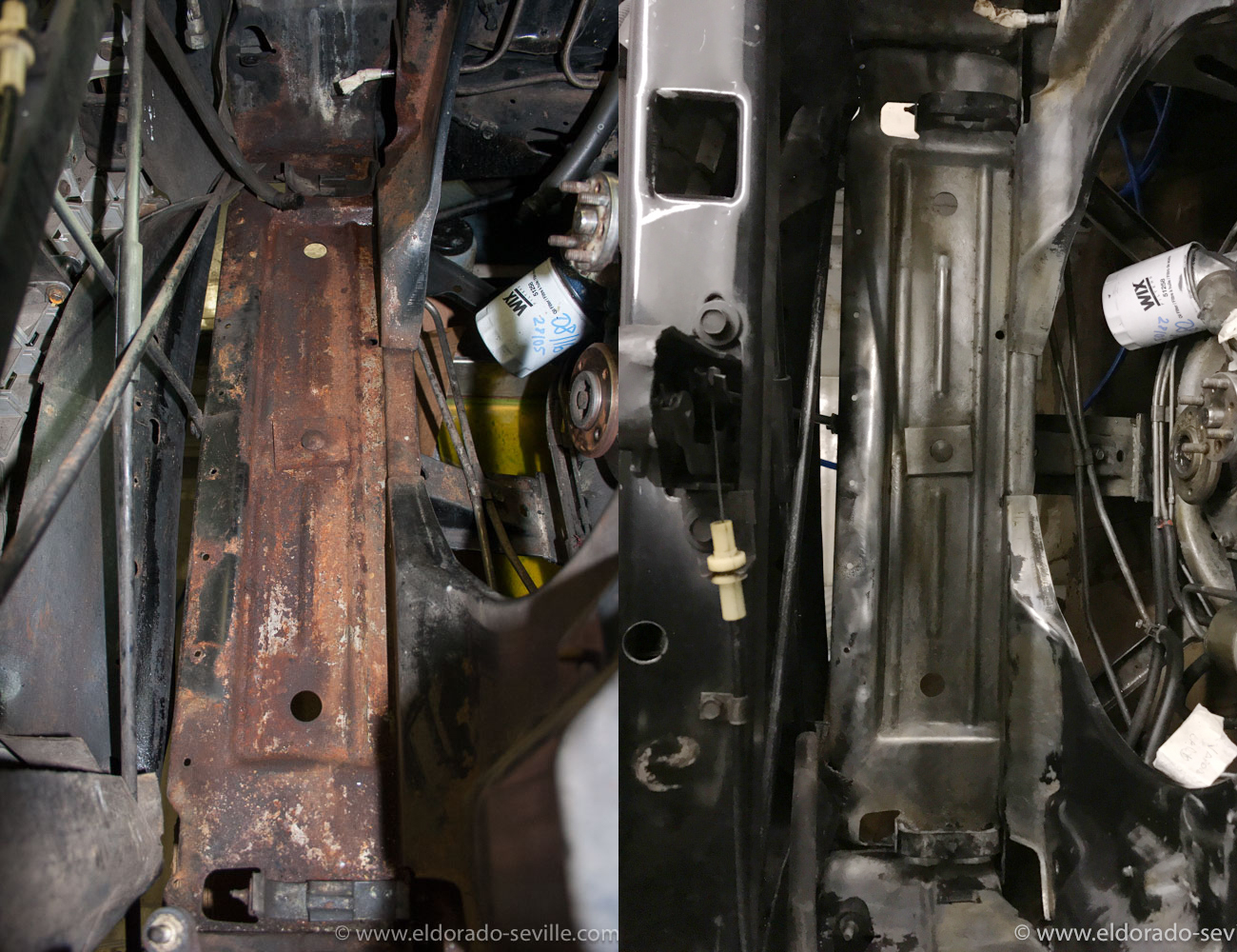 The radiator support frame before, after removing the rust and after painting